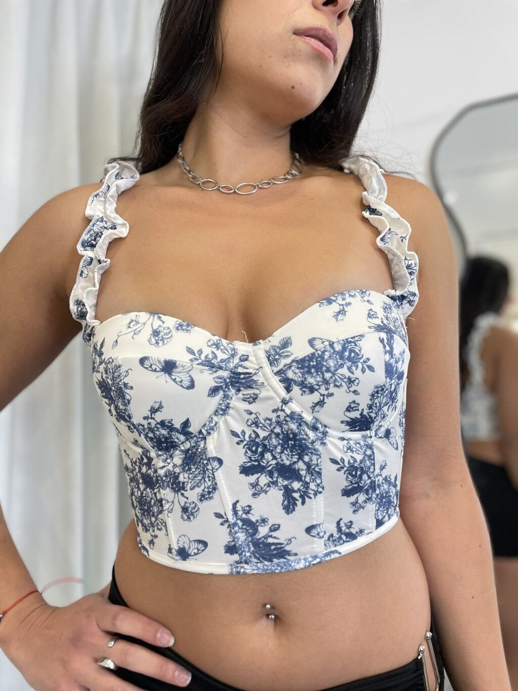 Ideal para combinar con faldas de tiro alto, jeans o shorts, este corset es la prenda perfecta para añadir un toque romántico y femenino a cualquier atuendo. ¡Atrévete a lucir diferente y capturar todas las miradas!